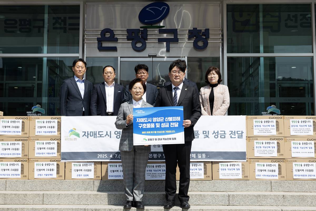 은평구(구청장 김미경)는 최근 산불로 큰 피해를 입은 자매도시 경북 영양군을 돕기 위해 지난달 27일 1차 지원에 이어 지난 7일 9천여만 원의 성금과 구호 물품을 전달했다고 밝혔다.