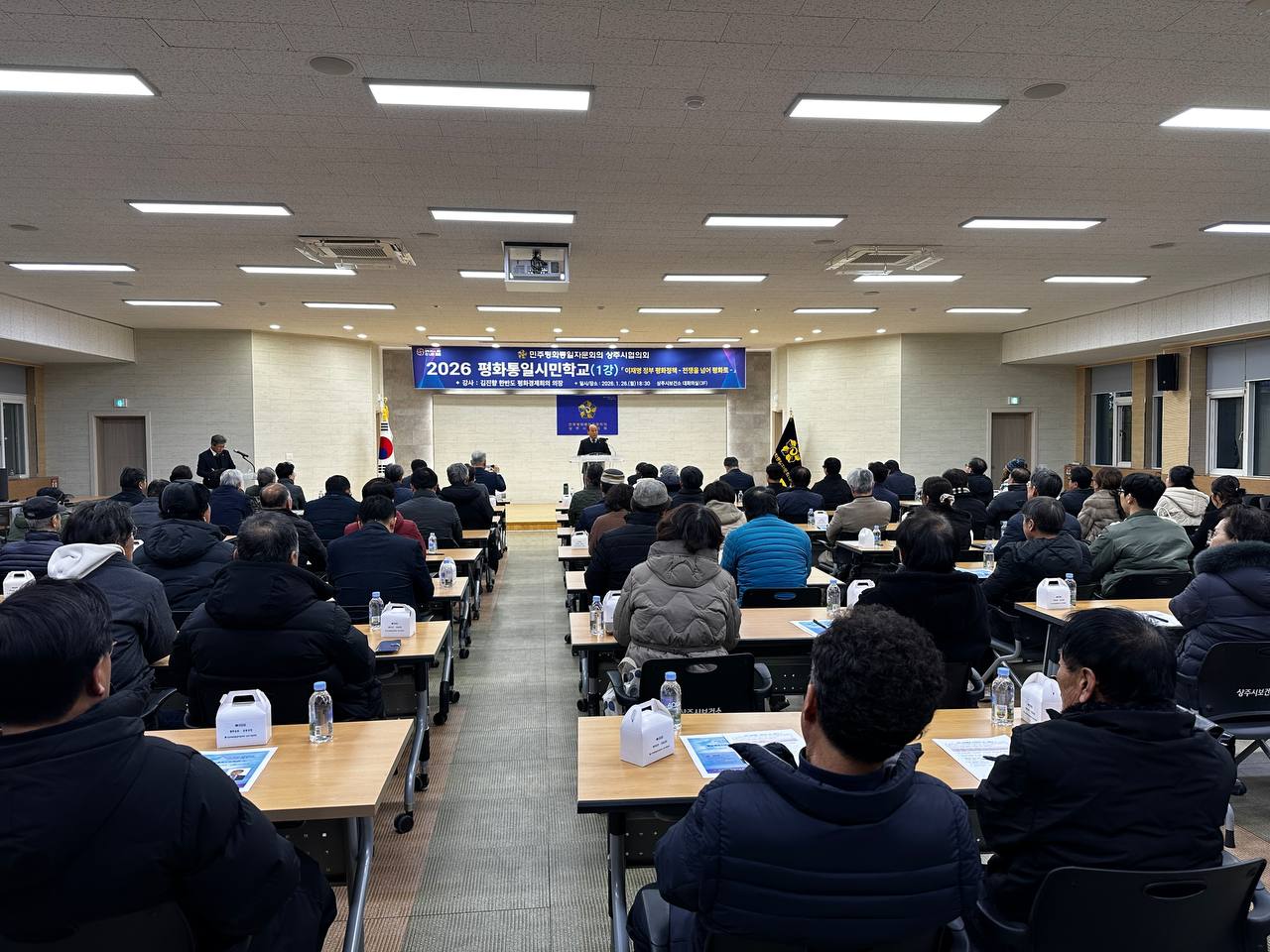 첫 번째 강의인 제1강은 1월 26일(월) 18:30분 상주시보건소 3층 회의실에서 개최되었으며, 시민 100여 명이 참석한 가운데 진행됐다. 이날 강연에는 김진향 한반도 평화경제회의 의장이 강사로 나와 「이재명 정부의 평화정책 -전쟁을 너머 평화로-」라는 주제로 특강을 진행했다.
