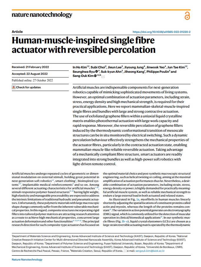헤라클레스 인공 근육은 국내에서도 그 중요성을 인정받아 과학기술정보통신부와 나노기술연구협의회가 수여하는 2023년 10대 나노기술에도 선정됐다. (기술명: 그래핀 나노 복합소재를 통해 인간 근육보다 17배 강한 헤라클레스 인공근육 개발 기술, 그림 4) 또한 과학기술정보통신부의 2023년 기계·소재 부문 국가연구개발 우수성과 100선에도 선정된 바 있다. (기술명: 그래핀-액정탄성체 복합소재 개발로 인간 근육보다 17배 강한 헤라클레스 인공 근육 세계 최초 구현)