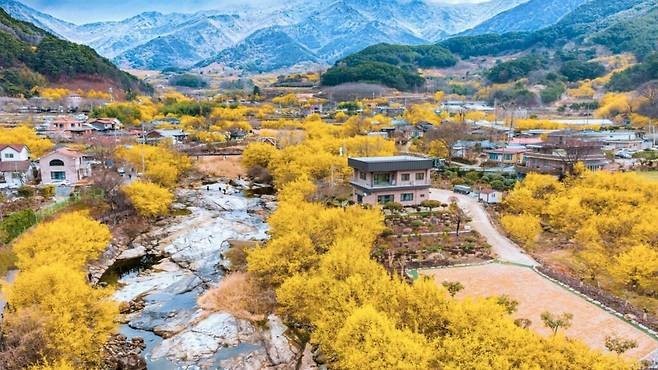 산촌생태마을로 조성된 이 지역은 봄의 산수유꽃 축제를 비롯해 여름 수락폭포 관광, 가을 열매 수확 체험, 겨울 설경 감상까지 사계절 활용도가 높다.