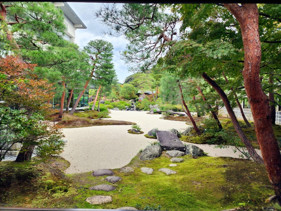 일본정원의 조원 기법 중 하나로 정원밖의 산과 나무등 자연물을 정원 풍경의 배경으로 사용하는 차경수법을 사용하여 빼어난 조형미를 자랑합니다