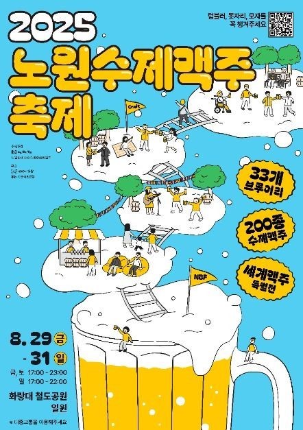 화랑대 철도공원 일원에서 열리는 2025 노원수제맥주축제(Nowon Beer Festival, NBF)는 전국 33개 브루어리의 200여 종 수제맥주, 7개국 세계맥주, 그리고 32대의 푸드트럭과 함께하는 진정한 맥주 애호가들의 축제다. 화랑대 축구장(제1광장)의 ‘맥주의 향연’, 기차마을 앞(제2광장)의 ‘세계의 만남’, 기차카페 일대(제3광장)의 ‘노원의 발견’이라는 3개 구역으로 나뉘어 운영되며, 각 공간은 먹거리·볼거리·체험거리를 두루 갖춘 복합 문화 공간으로 꾸며진다.